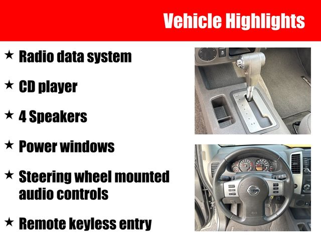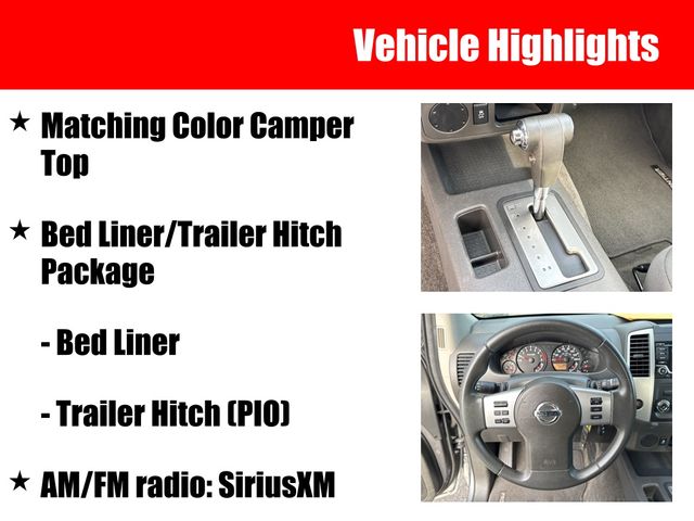 Beyond its impressive powertrain, this Frontier SV is loaded with a wealth of features that enhance both functionality and convenience. The Bluetooth Handsfree system allows you to stay connected on the go, while the matching color camper top provides versatile storage and protection. The Bed Liner/Trailer Hitch Package further expands the Frontier's utility, making it easy to haul your gear or tow your toys.