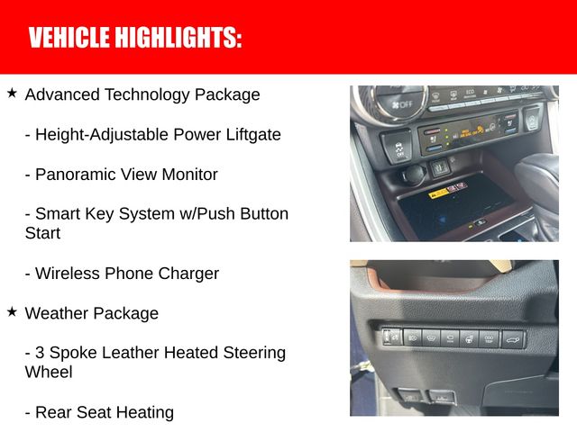The RAV4 Limited also comes equipped with the Weather Package, which includes Rear Seat Heating and a 3-Spoke Leather Heated Steering Wheel, ensuring your comfort in any climate. Additionally, the Advanced Technology Package adds even more convenience with features like the Wireless Phone Charger and Panoramic View Monitor.